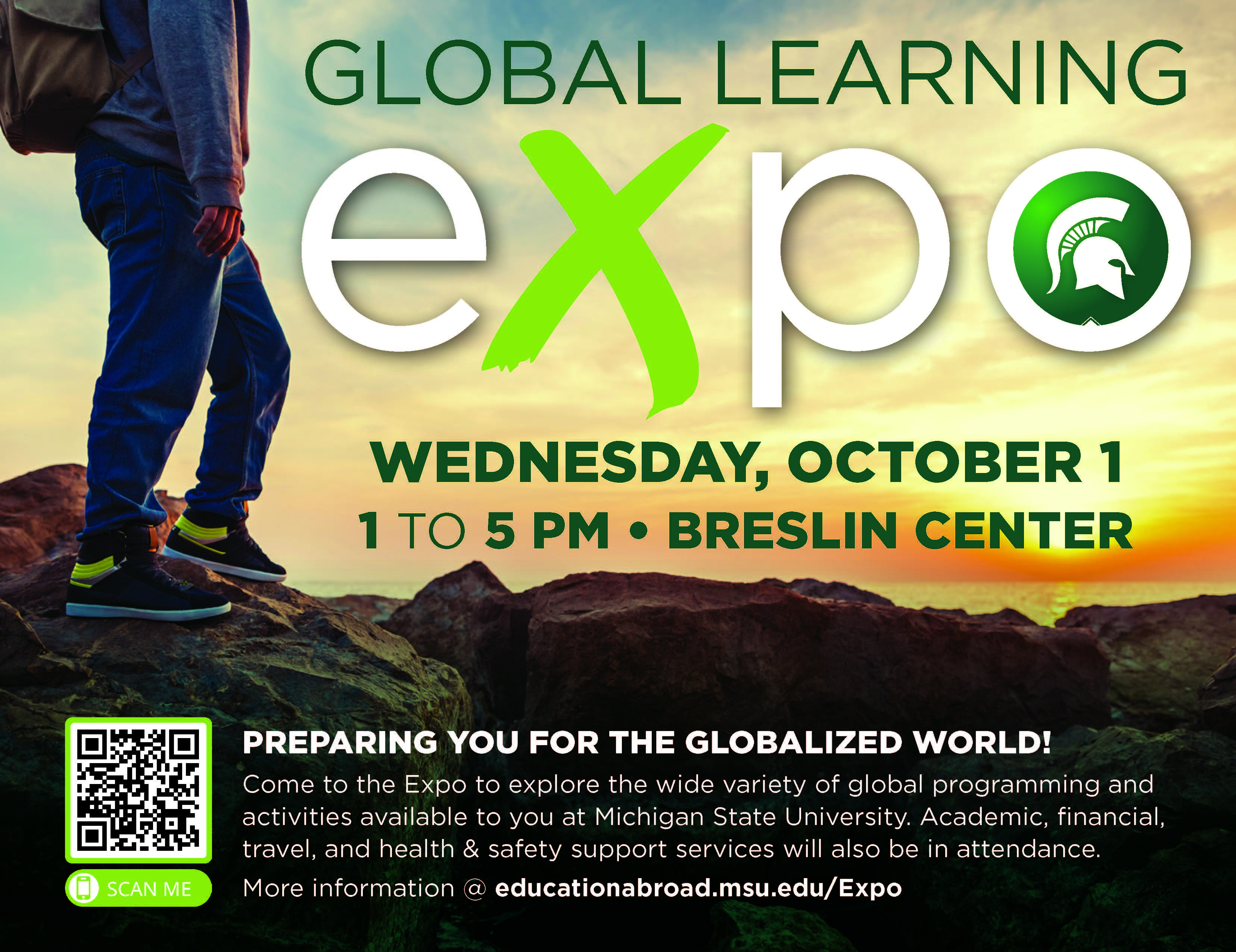Take your education global! Come to the Global Learning Expo this Wednesday Oct 1 from 1-5pm in the Breslin Center. Talk with faculty, staff, and students about programs to earn credits for your major, minor, or electives. https://tinyurl.com/MSUGLExpo #spartansabroad #globalspartans
