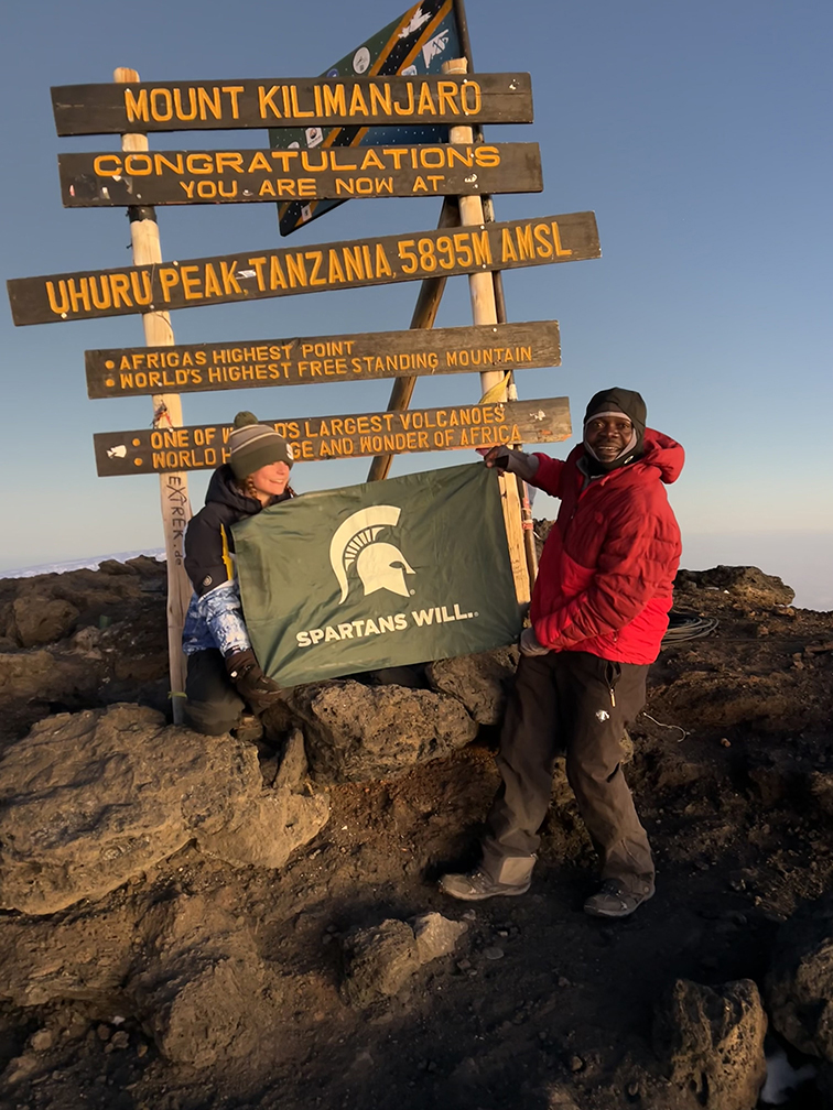 Proudly raising the "Spartans Will" flag in Tanzania at the top of the highest peak in Africa, Mt. Kilimanjaro, the tallest freestanding mountain in the world.
